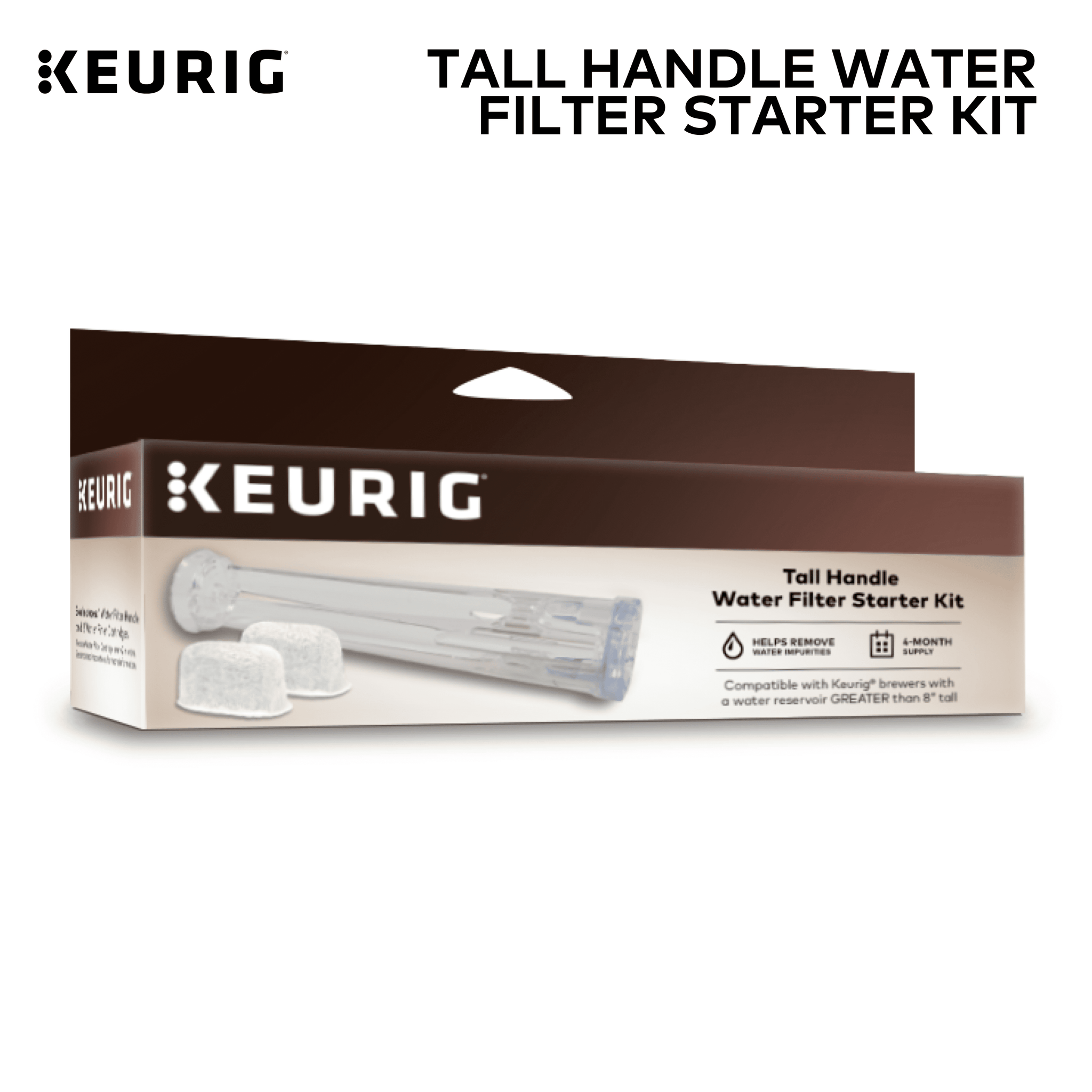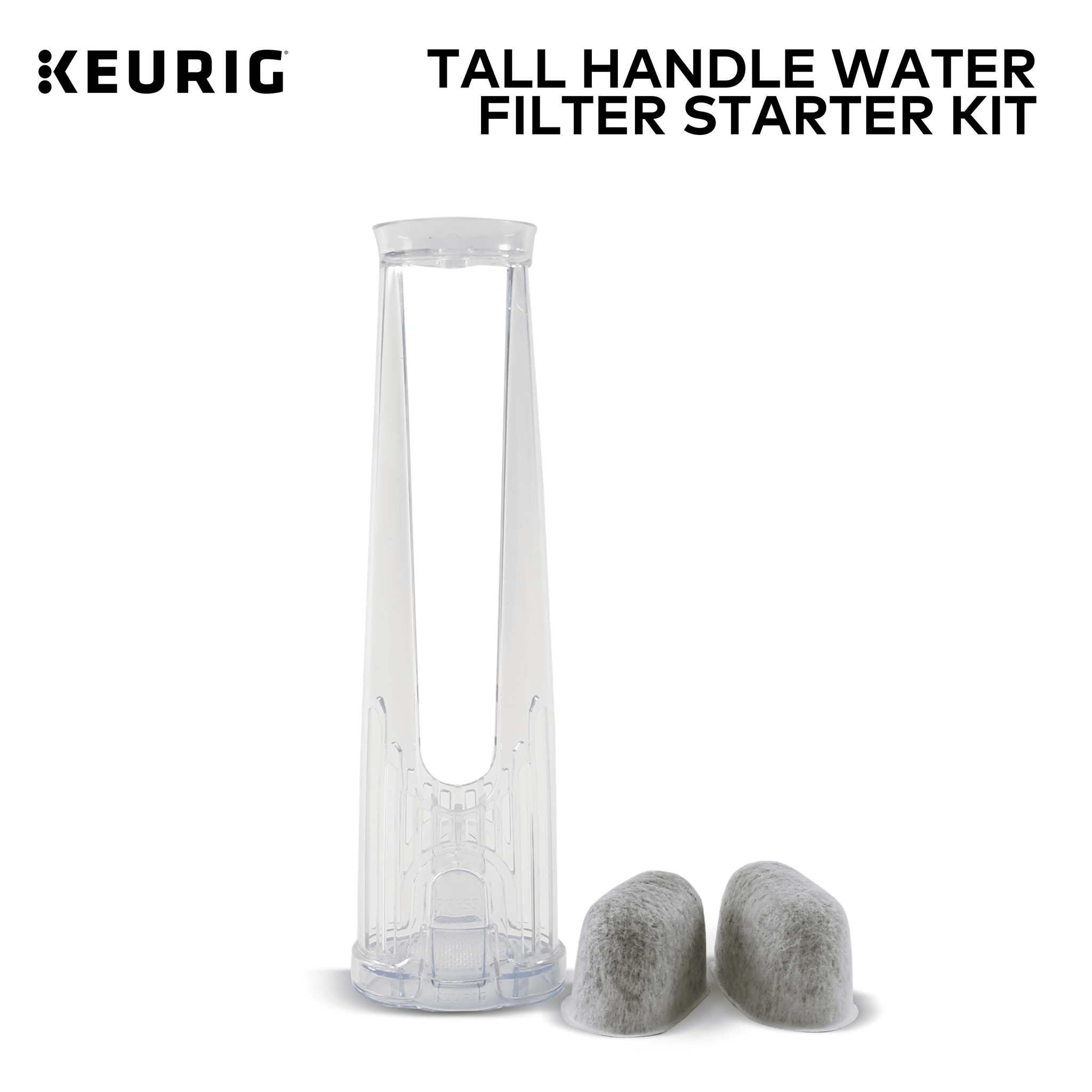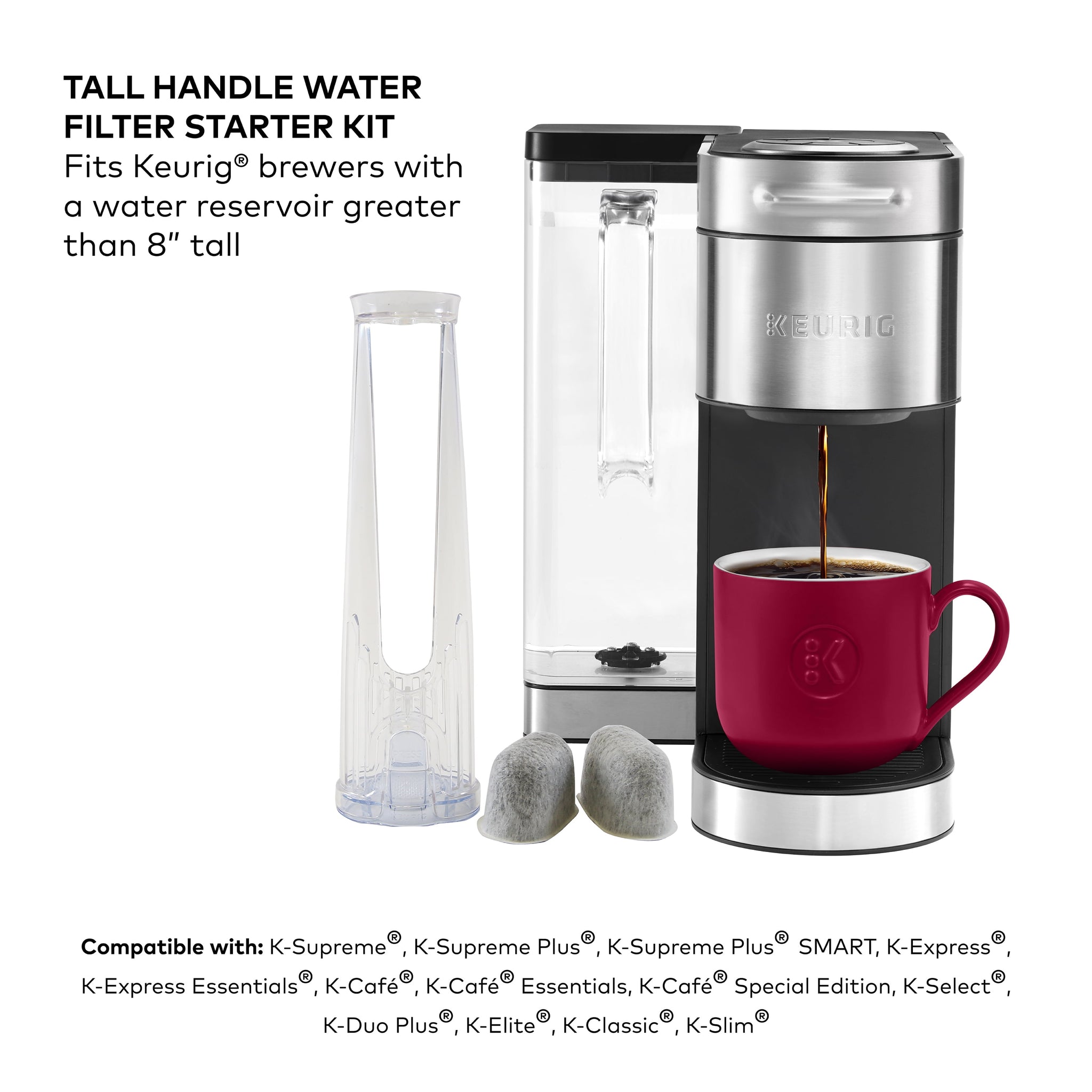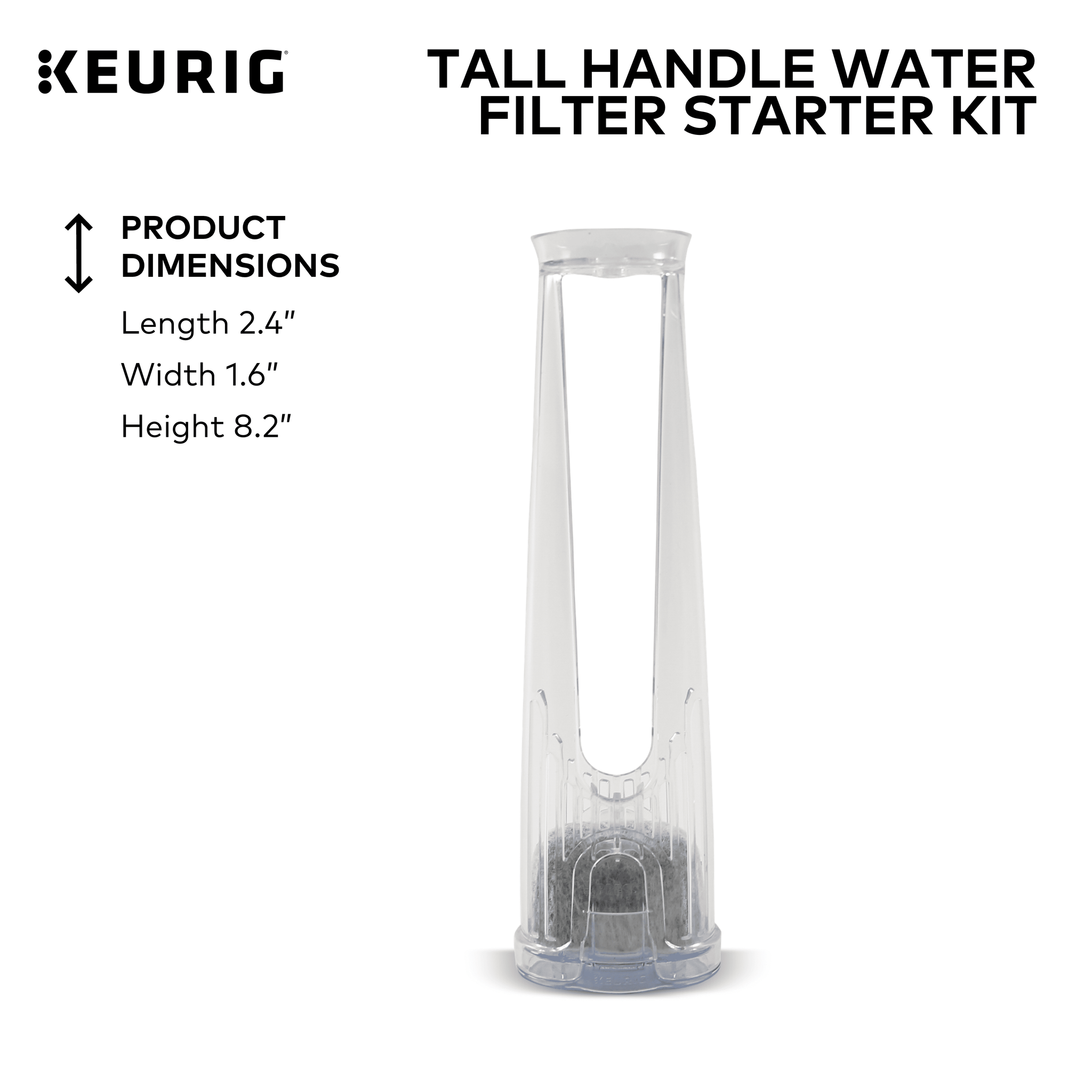 Great taste starts with great water. The Keurig Tall Handle Water Filter Starter Kit helps remove impurities and keeps beverages tasting their best, every time you brew. This easy-to-change water filtration kit fits Keurig single serve coffee makers with a water reservoir greater than 8” tall (check compatibility list to find your coffee maker). Each kit includes one water filter handle and two replacement filters (a 2-month supply each). Additional replacement filter cartridges sold separately. Compatible with Keurig coffee makers with a water reservoir GREATER THAN 8” Tall (including: K-Supreme Series, K-Duo Plus, K-Café Series, K-Elite, K-Select, K-Classic, K-Slim)